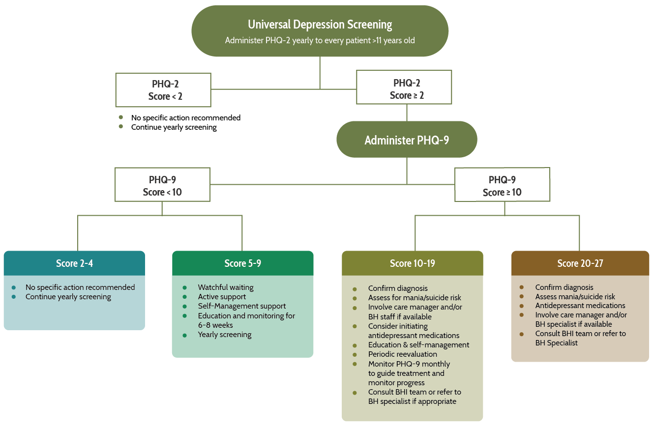The AHP Behavioral Health Integration (BHI) team recommends screening for depression in individuals ages 12 and over at least once yearly. Peripartum women should be screened at least once during their pregnancy and postpartum period. Individuals who score positive on the PHQ 9 (score 10 and above) should be screened again every 4 weeks to assess their progress and guide their treatment. It is important to note that although the recommendation is to perform a follow up screen every 4 weeks, patients may need to be have follow up visits in person or by phone more frequently. This is particularly true in adolescents with depression.12 Clinical judgement should always guide the frequency of follow up in depression.